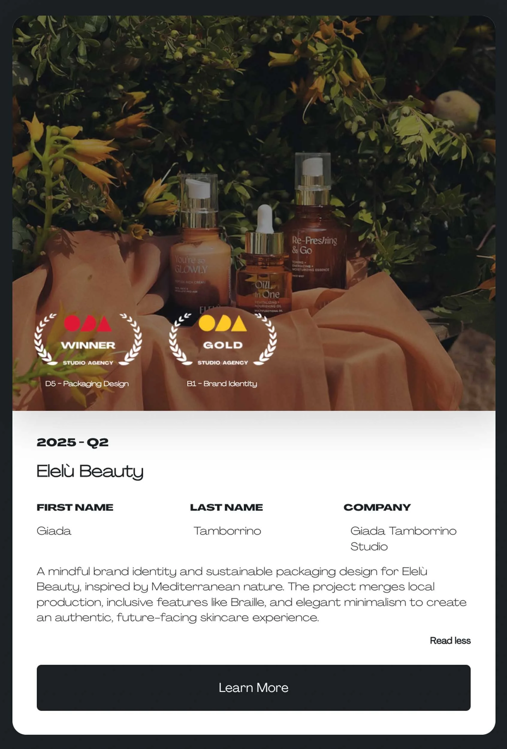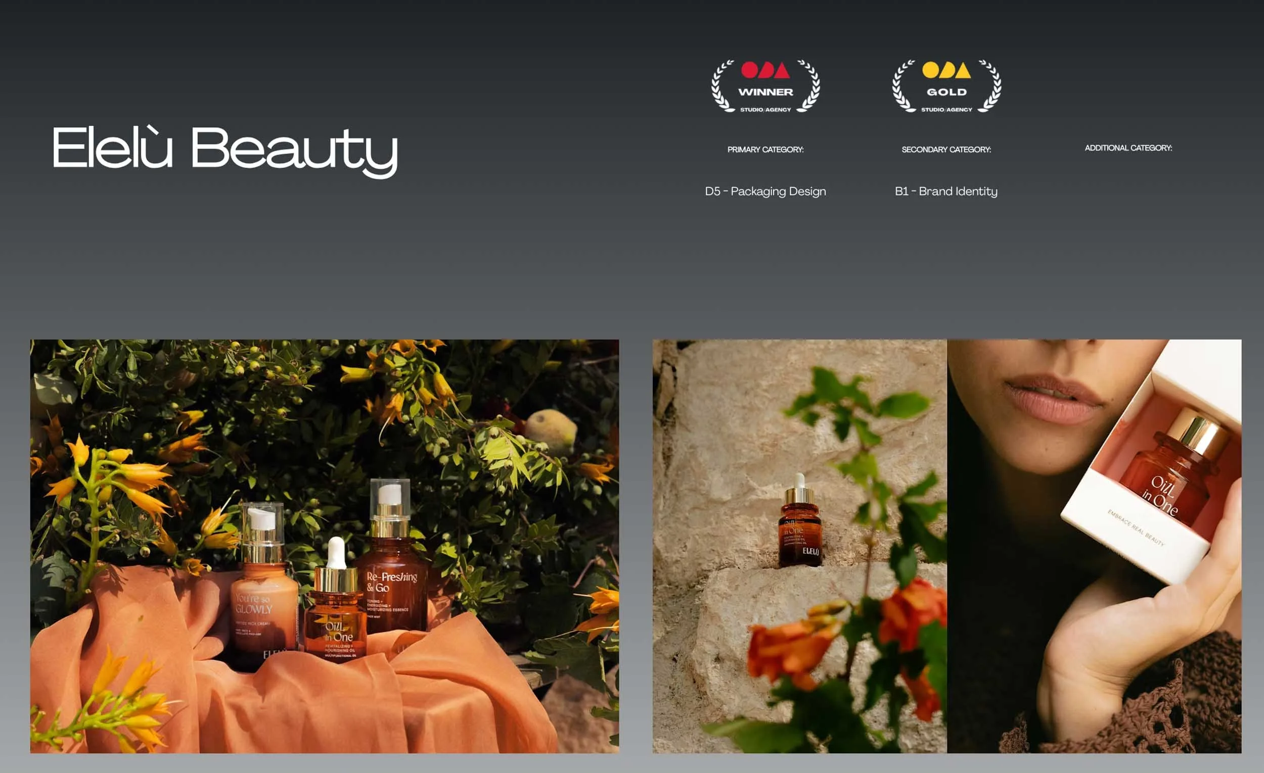 I’m thrilled to share that Giada Tamborrino Studio has been recognised in the Online Design Awards Q2 2025 Competition for our work on Elelù Beauty, winning Studio/Agency Winner in the Packaging Design category and Studio/Agency Gold in the Brand Identity category.