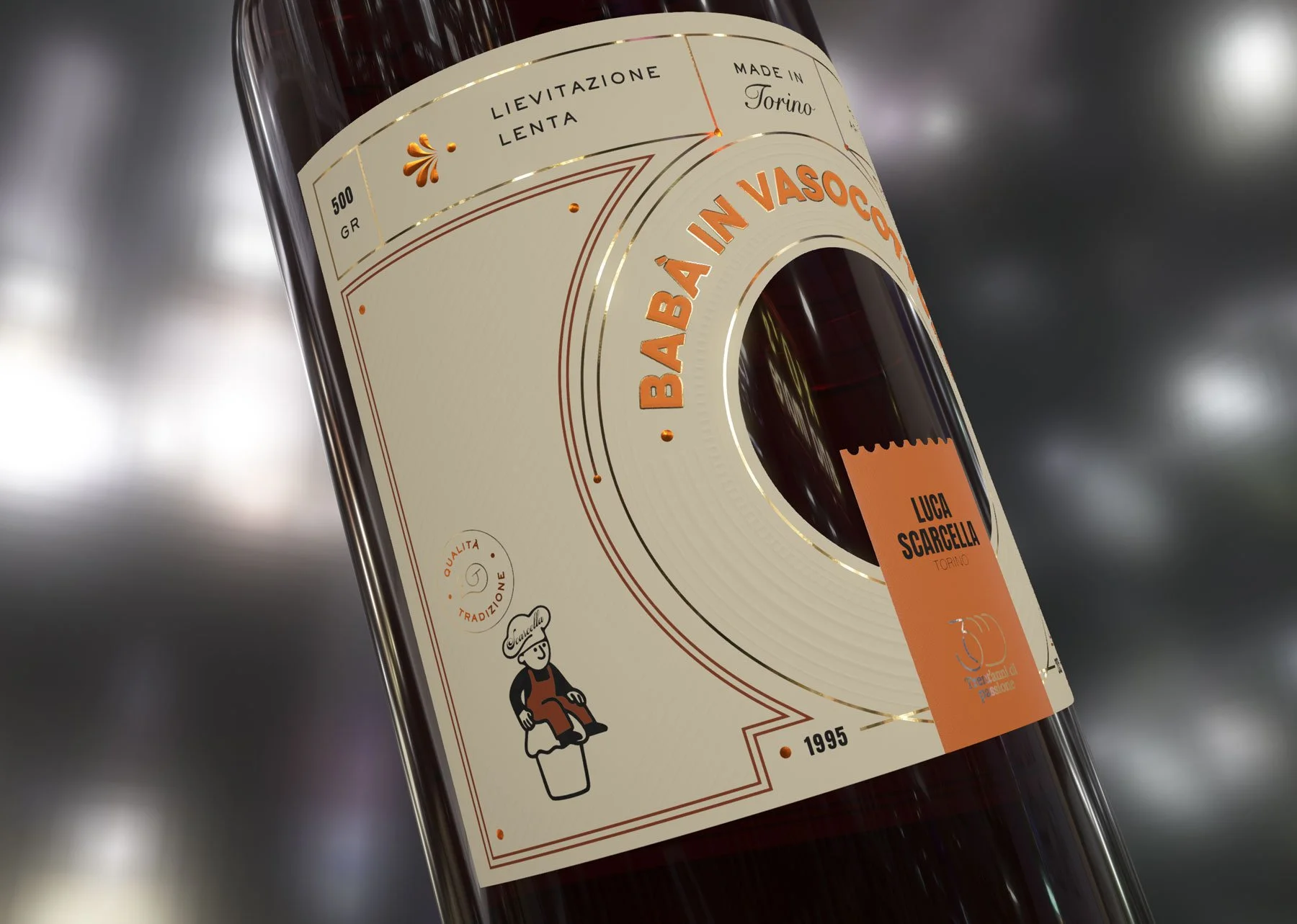 Close up of a digital 3D mockup of the label design for babà in vasocottura, showing layout, embossing, and foil placement